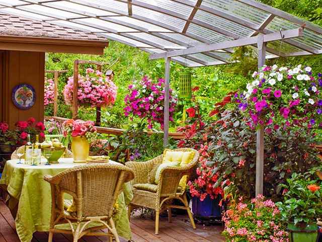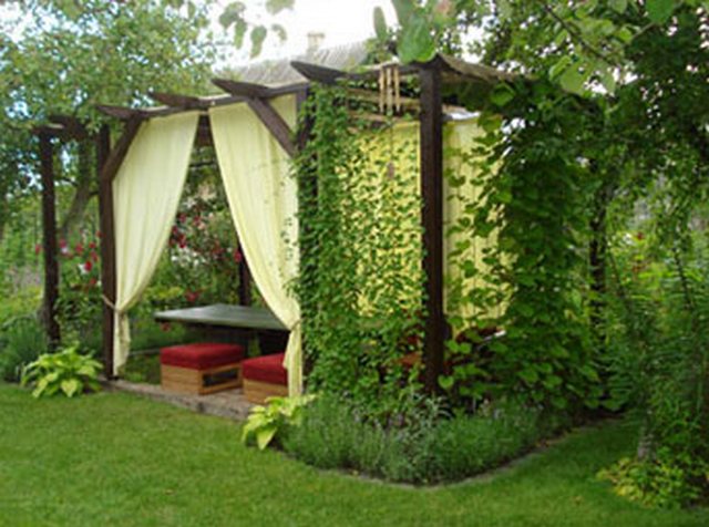 Следует позаботиться о том, чтобы озеленить вашу беседку, например, вьющимися растениями или низкими цветами. Низкие цветы вы сможет разместить по всему периметру или внутри беседки. По контуру площадки может расставить цветущую зелень, а вьющуюся ближе к стойкам. Ни в коем случае не сажайте цветы поблизости к мангалу, лучше ближе к зоне отдыха. Озеленение хорошо тем, что вы можете выбрать понравившиеся вам сорта цветов, которые вы сможете чередовать. Поближе к беседке высаживайте высокие цветы, а по всему периметру низкие. Неплохо будут смотреться навесные горшки с ярко высаженными туда цветами. Для того чтобы у вас были определены границы клумб, воспользуйтесь пластиковыми заборами. Если у вас каменная беседка, то с северной стороны украсьте её амурским виноградом. Это придаст беседки вид заброшенной местности и будет царить необычная атмосфера.