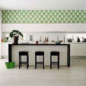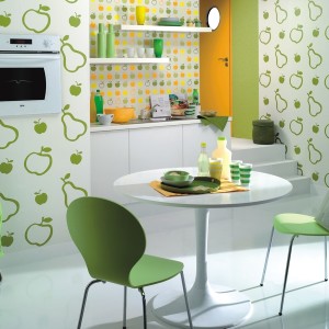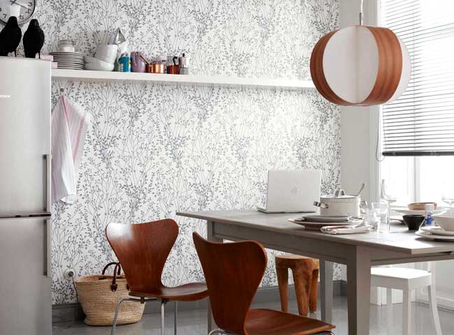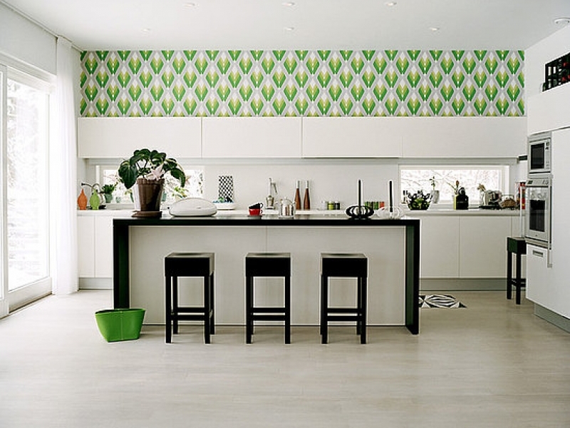 Наиболее неподходящие обои для кухни – бумажные. Они тонкие, не моющиеся и прослужат не более 4 лет. Большой популярностью в отделке кухни пользуются виниловые, стекло, моющиеся и флизелиновые обои. Если они испачкались, то их можно легко помыть, они не впитывают запахи, к тому же они прочнее, чем бумажные. Для места готовки не подойдут акриловые обои, так как они могут испачкаться. Кроме того, не следует покупать обои в состав которых входит текстиль, так как они впитывают запахи. Лучшим выбором для кухни станут чистящиеся и жаростойкие виниловые обои.